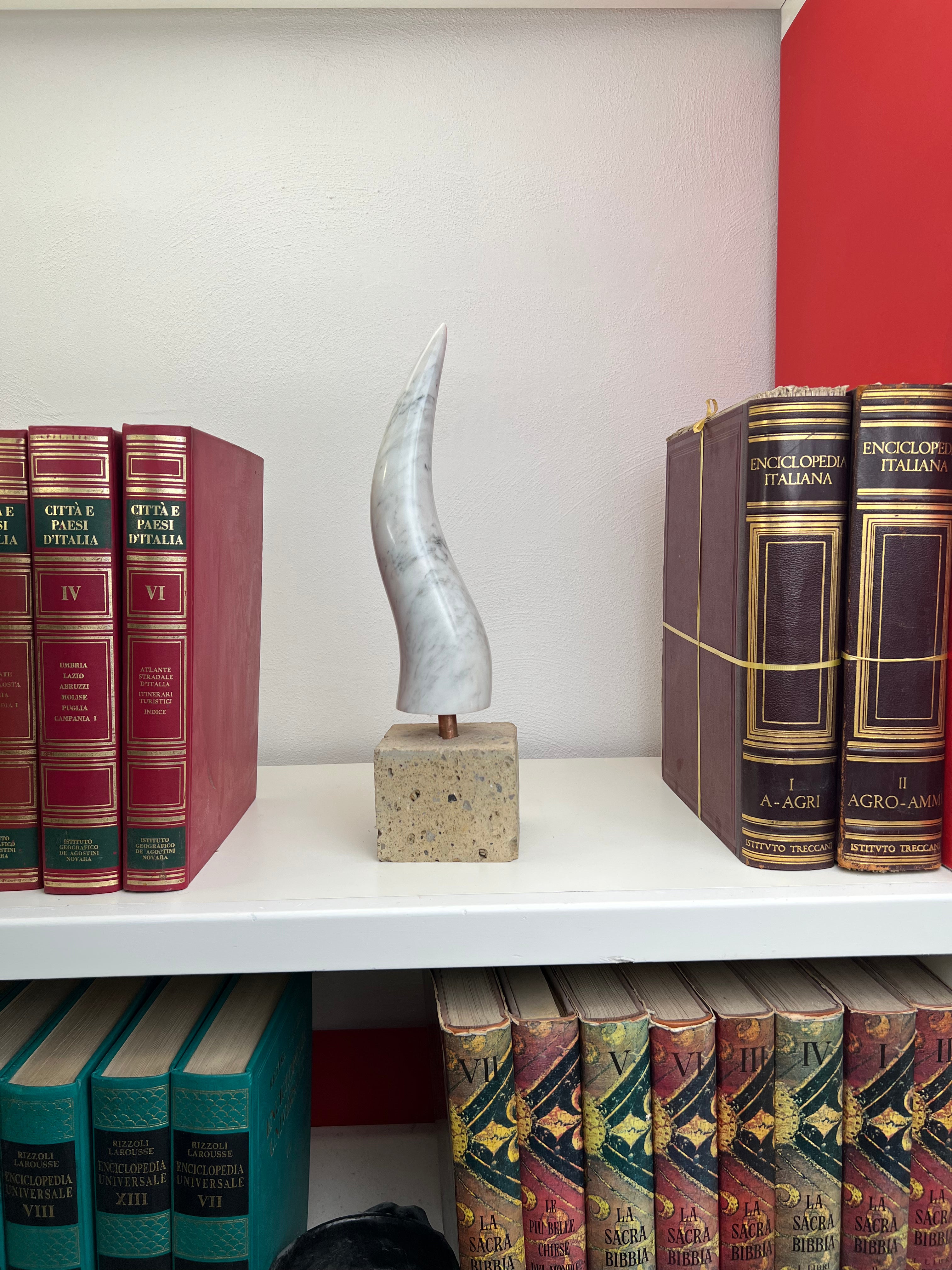 Beauté du Marbre, Énergie du Cuivre, Force de la Pierre. Sculpté dans un bloc de marbre blanc de Carrare grâce à une technologie robotique. Poli à la main, il est soutenu par un élément en cuivre sur une base en pierre de lave, tuf ou marbre.