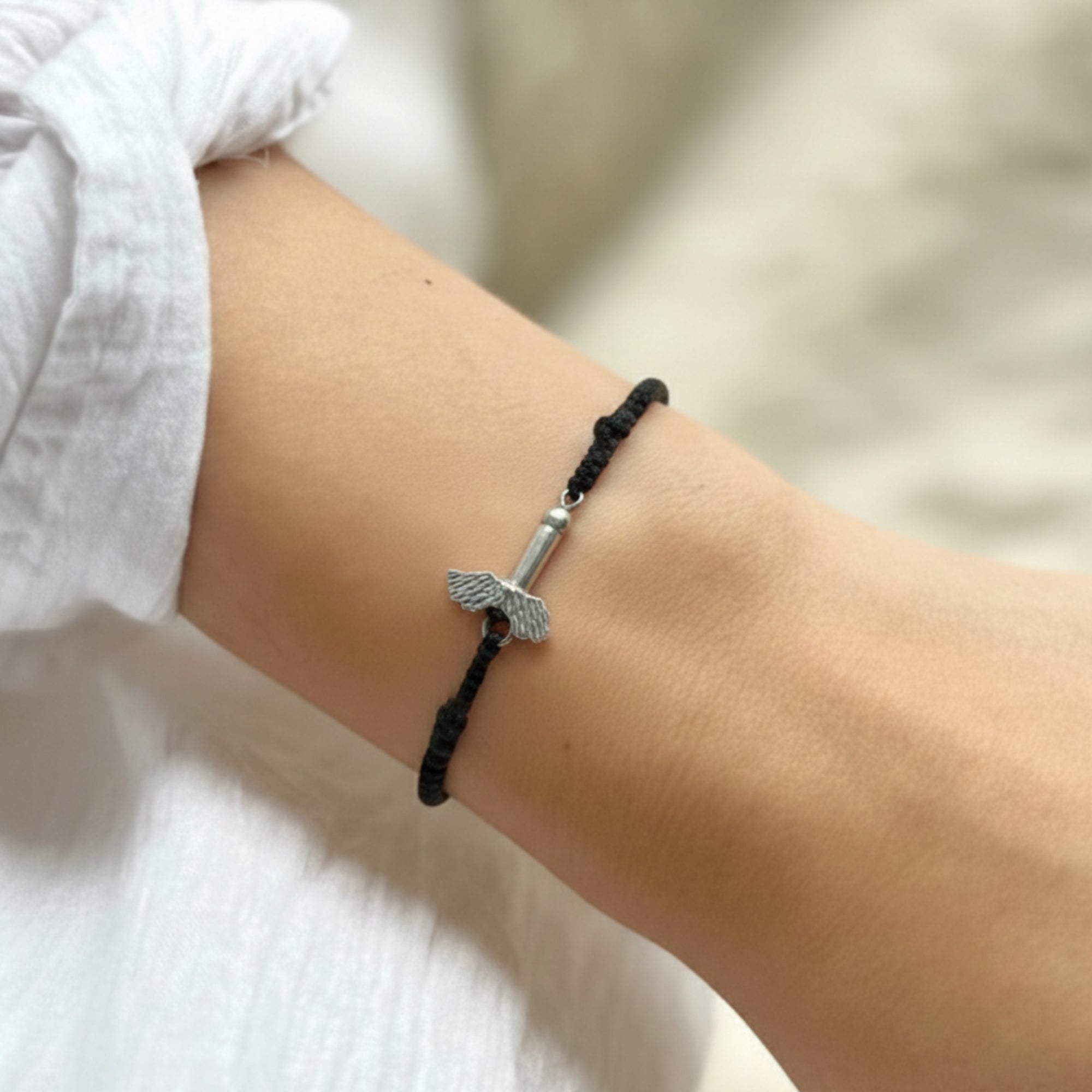 Bracciale con filo di cotone e Fallo Alato in Argento