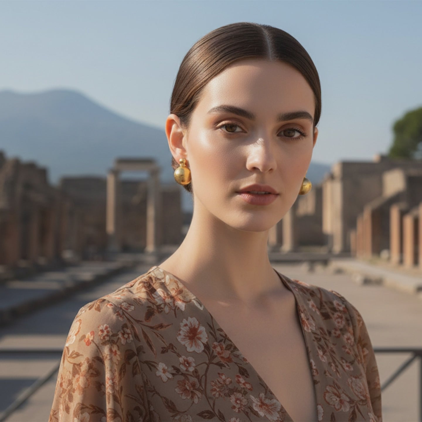 Pompei ha restituito straordinari esempi di gioielleria antica durante gli scavi archeologici. Gli orecchini e i gioielli di Pompei non erano solo simboli di bellezza, ma avevano anche significati culturali e religiosi. Le sfere lisce erano un motivo comune nei gioielli romani, poiché rappresentavano la perfezione e l'armonia dell'universo. I gioielli di Pompei, spesso indossati da donne di alto rango, erano realizzati in oro e argento e venivano arricchiti con pietre preziose o con design geometrici, proprio come le sfere presenti in questi orecchini.